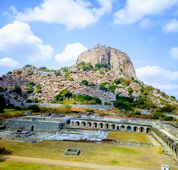 The Gingee Fort complex is spread on three hillocks, Krishnagiri to the north, Rajagiri to the west, and Chandrayandurg to the southeast. It was built at a height of 800 feet and protected by an 80 feet wide moat.